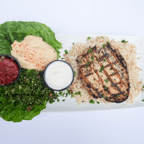 Grilled chicken breast topped with garlic lemony sauce. Served with rice, soup or salad, pita bread and side of garlic sauce.