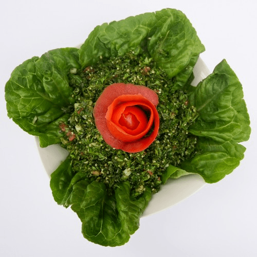 Parsley, tomato, cucumber, green onion, cracked wheat (burghul), olive oil and lemon dressing.