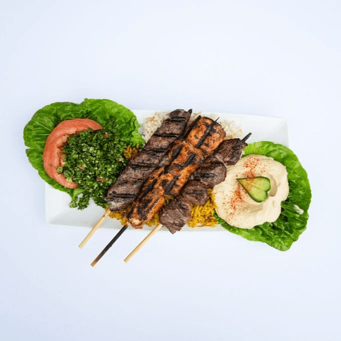 1 skewer of chicken kebab, 1 skewer of beef kebab, 1 skewer of kafta kebab
